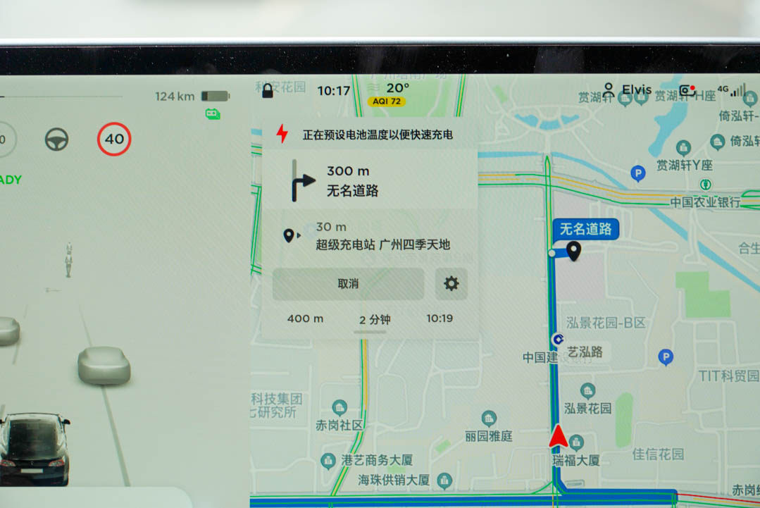 导航设定前往充电站的路上,车辆会自动预热,为的就是安全地完成快充,但预热过程会耗掉不少的电量,所以几公里的路程掉了将近10km的续航里程,这点还是值得注意的。