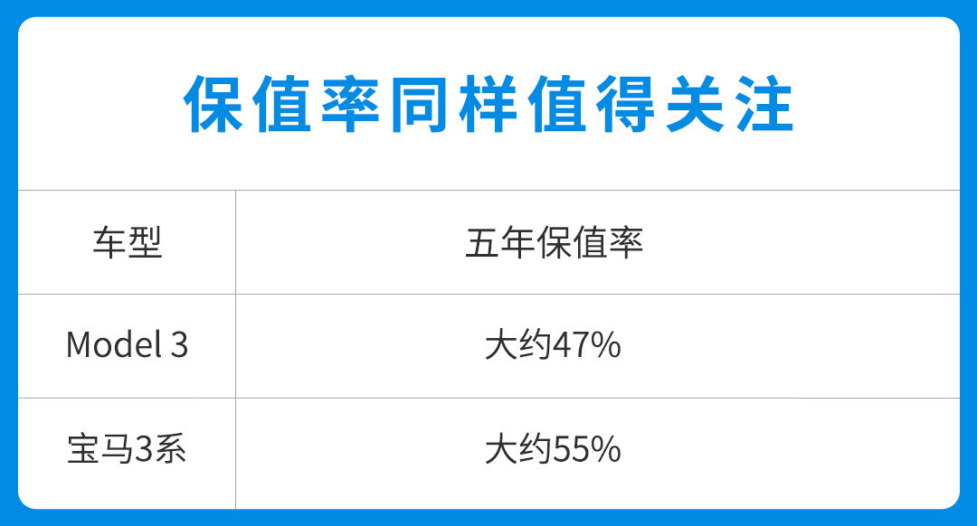 保值率也是关键,按照某二手车平台的数据显示,Model 3的保值率并不容乐观,即便是比起并不保值的同级别BBA车型,保值率都要低了8%,也就是说开五年,很有可能一半的钱都卖不到。