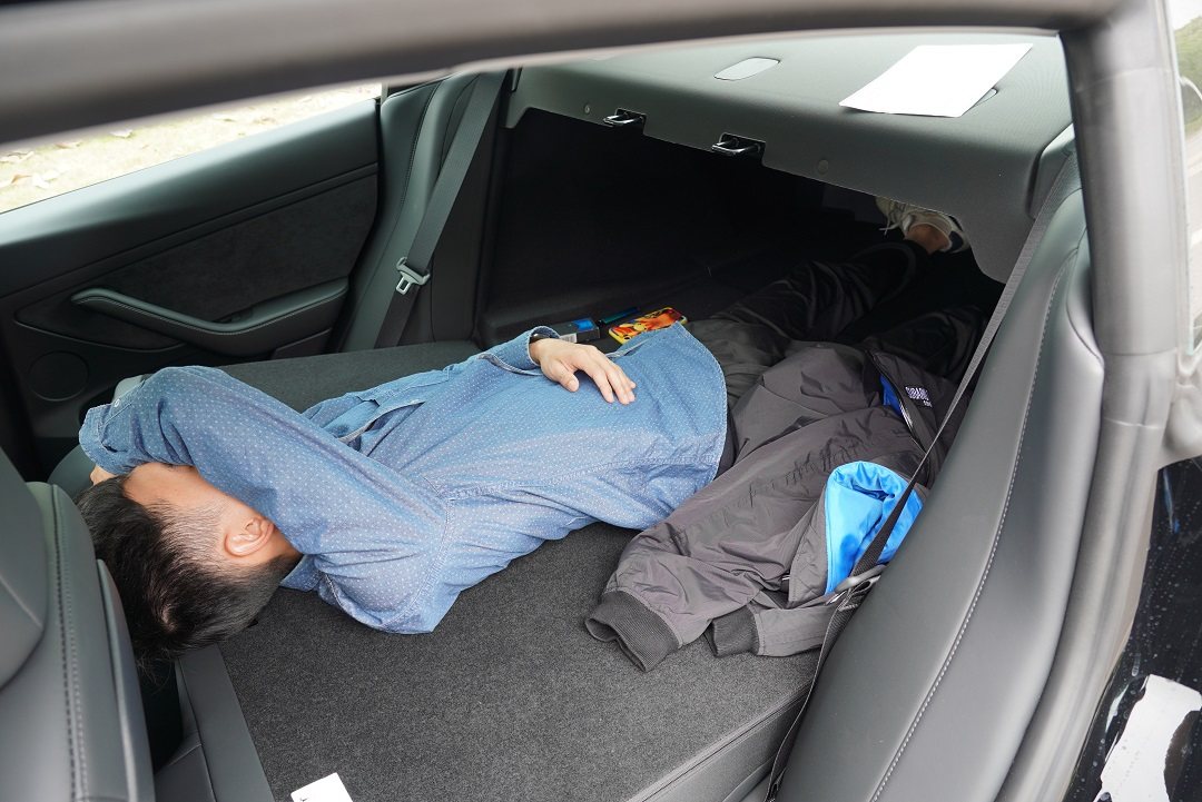 有趣的是,或许特斯拉自己也知道Model 3的后排座椅坐着不咋地,于是还提供了一个名为露营模式的使用方式,在后排靠背的背面值了一层绒,将其放倒就能与后备箱形成略带角度的“床”。