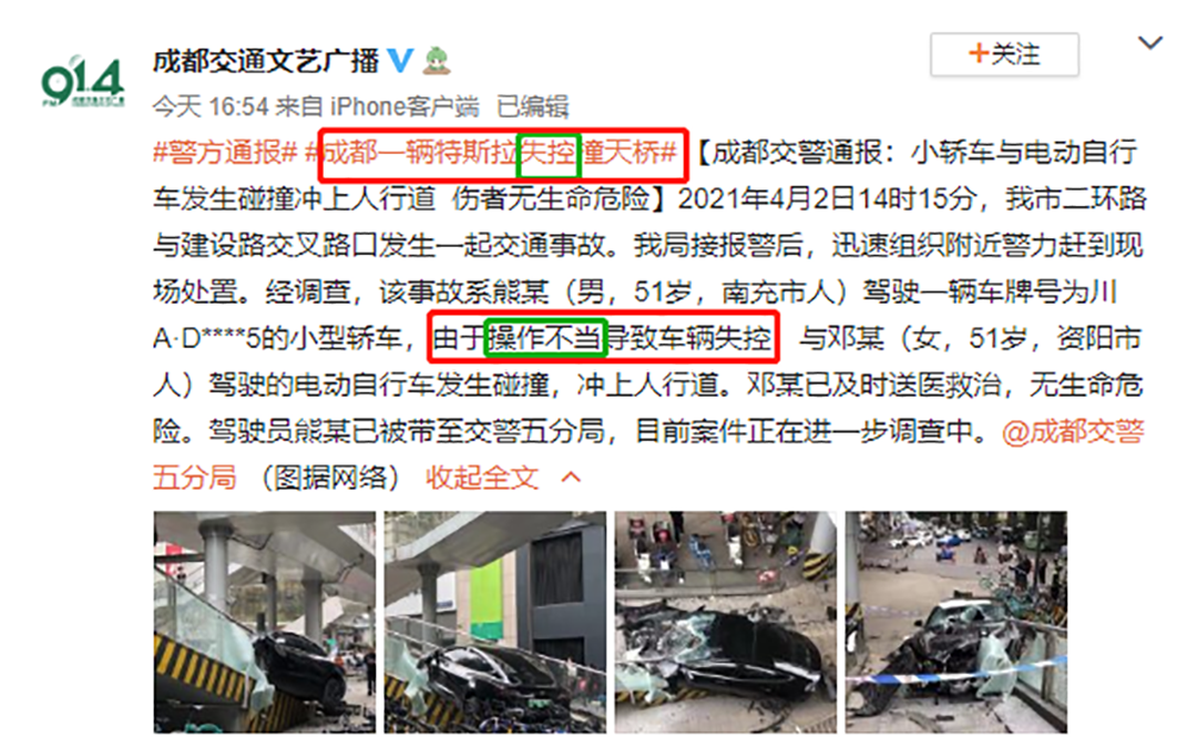 误操作在前,事故发生在后,当事人为了逃脱第一责任,直接对外甩锅“车辆失控”所致。