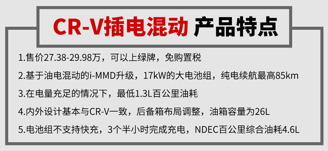不废话,先用一张图说完CR-V插电混动的产品关键点,就像我用在头图里的那句话一样,“多一点”是它的产品关键词:更贵,配置更丰富,电池组更大,能上绿牌.......CR-V车系的特质,在它身上都得到了很好体现,虽然它是一款新能源产品,但它更是一辆你熟悉的CR-V。