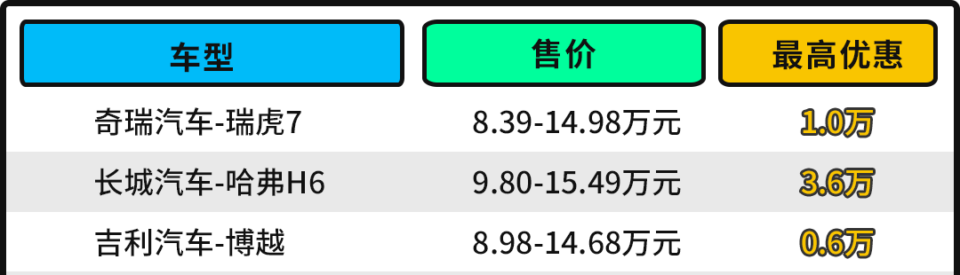除了超强的产品实力,较低的定价策略也是瑞虎7的一大优势,瑞虎7官方指导价区间为8.39-14.98万元,相比吉利博越和哈弗H6有一定的优势,同时终端市场上有1万左右的优惠力度,性价比相当高。加上此次新增了超能版车型,更为年轻运动化的设计,更为丰富的配置,相信能受到很多年轻消费者的追捧。