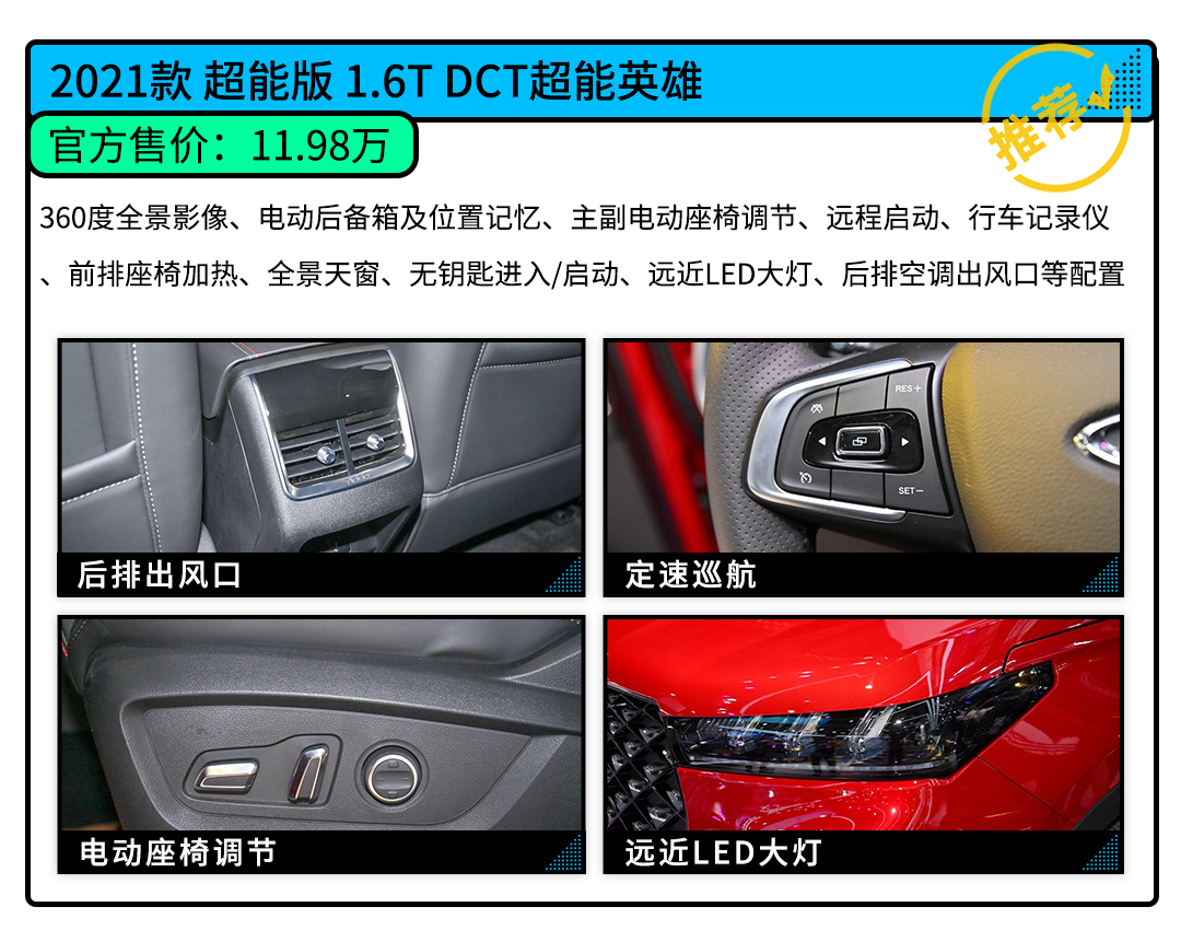 所以在配置选择上,买买君肯定是更加青睐超能版车型的,超能版有超能勇士和超能英雄两款车型,它们之间售价差了9000元,多了360度全景影像、电动后备箱及位置记忆、蓝牙钥匙、远程启动、行车记录仪、前排座椅加热、GPS导航系统、多媒体语音控制系统、车联网/OTA升级、自动头灯、全车窗一键升降、后视镜锁车自动折叠等十几项配置,同时还可以选装前面所说的L2级别驾驶辅助系统,性价比可谓非常高。