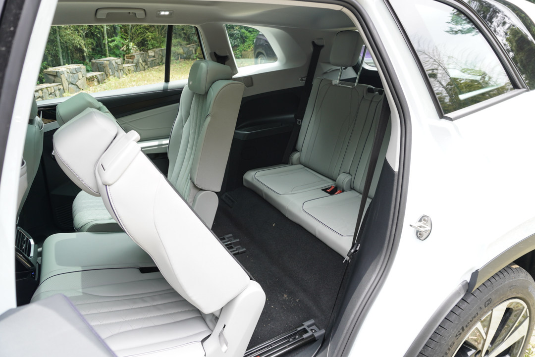 座椅布局方面,ID.6 X提供了6座和7座布局,其中我们试驾的这款是最多人喜欢的2-3-2的7座布局,无论是第二排还是第三排座椅都配有可调节头枕,而且第二排座椅还支持调整靠背角度,这两点是比较值得好评的。