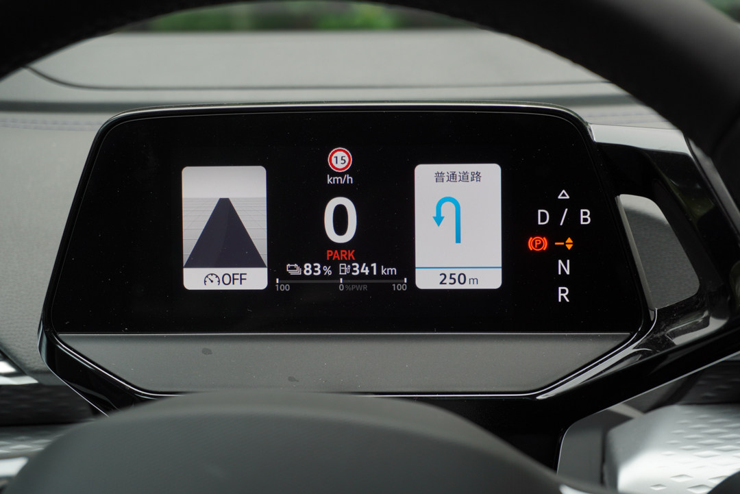 与ID.4 X一样,这块安装在方向盘柱上的液晶仪表盘尺寸不算大,只有5.3英寸,而且旁边还集成了旋转式挡杆。但胜在屏幕的显示效果还算细腻,驾驶数据、驾驶辅助、导航等信息比较直观,功能上与主流的大尺寸液晶屏相差无几。