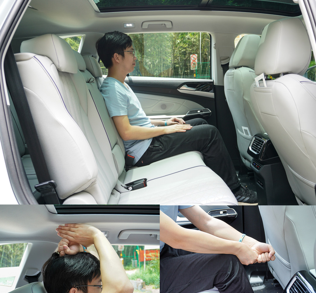 保持前排座椅不动,将第二排座椅调到最靠后时,体验者的头部空间余量为一拳四指,腿部空间更是超过两拳,哪怕是身高185 cm的成年人也能轻松落座后排。而且后排还带有中央扶手、独立空调、充电接口等配置,加上几乎纯平的地台,长时间乘坐也不会不适。