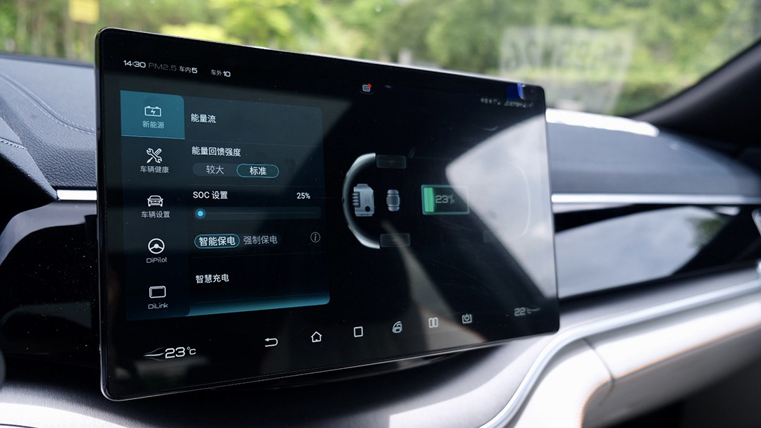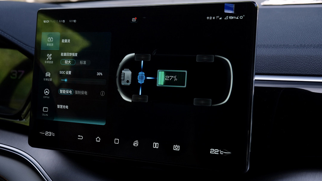 我们也可以从全液晶仪表盘、中控屏幕上查看能量流状态,一般状态为电驱动,发动机处于待命状态;若是电量不足,发动机则进行充电为电动机提供电力;高速行驶或者需要急加速时,电动机、发动机、电池相互协助,实现最大电机输出并配以发动机助力。
