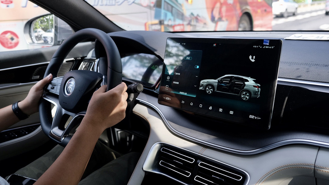 而它还是极简风格,T型布局下的中控台,按键统统布置在档把四周的BYD Heart比亚迪智汇之心部分,可以不分心地调节行驶所需功能,另外它能通过强大的语音助手进行调节音响、车窗以及空调。