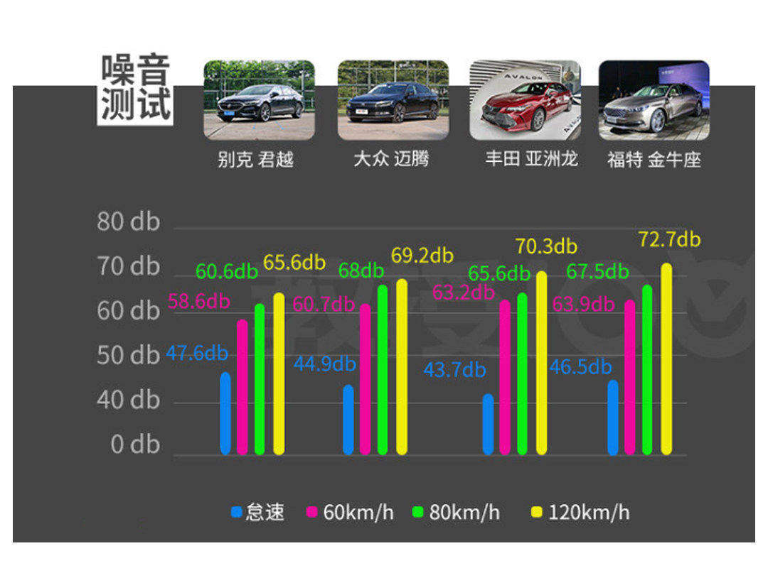 作为商务与豪华定位的旗舰车型,君越在用料和隔音这些用车体验方面自然不能差。首先从隔音方面来看,君越采用了双层隔音玻璃,以及BOSE提供的ANC主动降噪技术,这些工艺确实赋予了车辆更好的静谧性。经过实际测试,君越在60km/h、80km/h、120km/h的车速中测试的车内噪音方面明显低于亚洲龙等同级竞品。