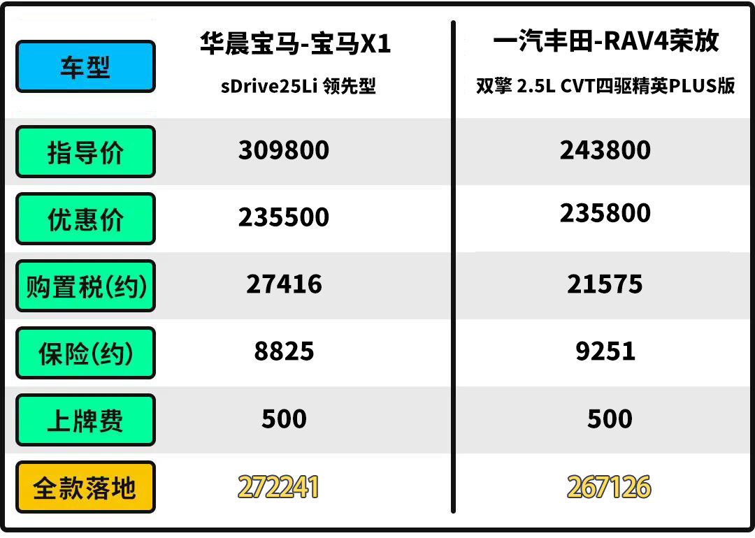 虽然宝马X1作为家族中较为“异类”的前驱车型,但从市场表现来看,消费者对这辆离经叛道的宝马还是买账的。4565/1821/1620mm的长宽高以及2780mm的轴距无论是相较奥迪Q3这类竞品还是放眼整个紧凑型SUV市场上都有着不小的优势。并且车辆的终端优惠高达7.43万元,指导价虽然30.98万元的车型优惠后裸车价仅23.55万元,算上购置税、保险等费用后,实际的落地价不过仅27.22万元。与丰田RAV4荣放双擎售价相当。