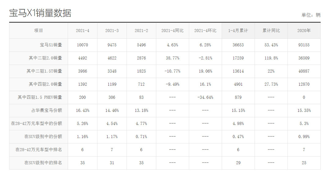 X1入门版车型搭载的这款1.5T发动机最大功率140Ps,峰值扭矩220N·m,这样的账面数据完全满足日常用车的动力需求,但这台1.5T三缸运行起来的稳定性和噪音确实比较明显,导致了大部分消费者对其并不买账。从销量上来看4月份宝马X1的10070辆单月销售车型中,2.0T前驱和四驱版共5884辆,占总数的58.4%。
