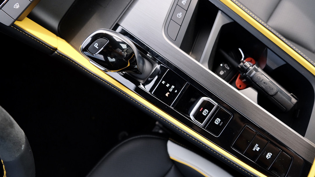 内饰部分,营造了极强的战斗感。麋皮材质的平底式方向盘,还带有一个硕大的红色超级运动模式按钮,神似“鸡腿”样式的电子档把,还有撞色的内饰配搭。整体看起来清爽时尚同时,还很运动。