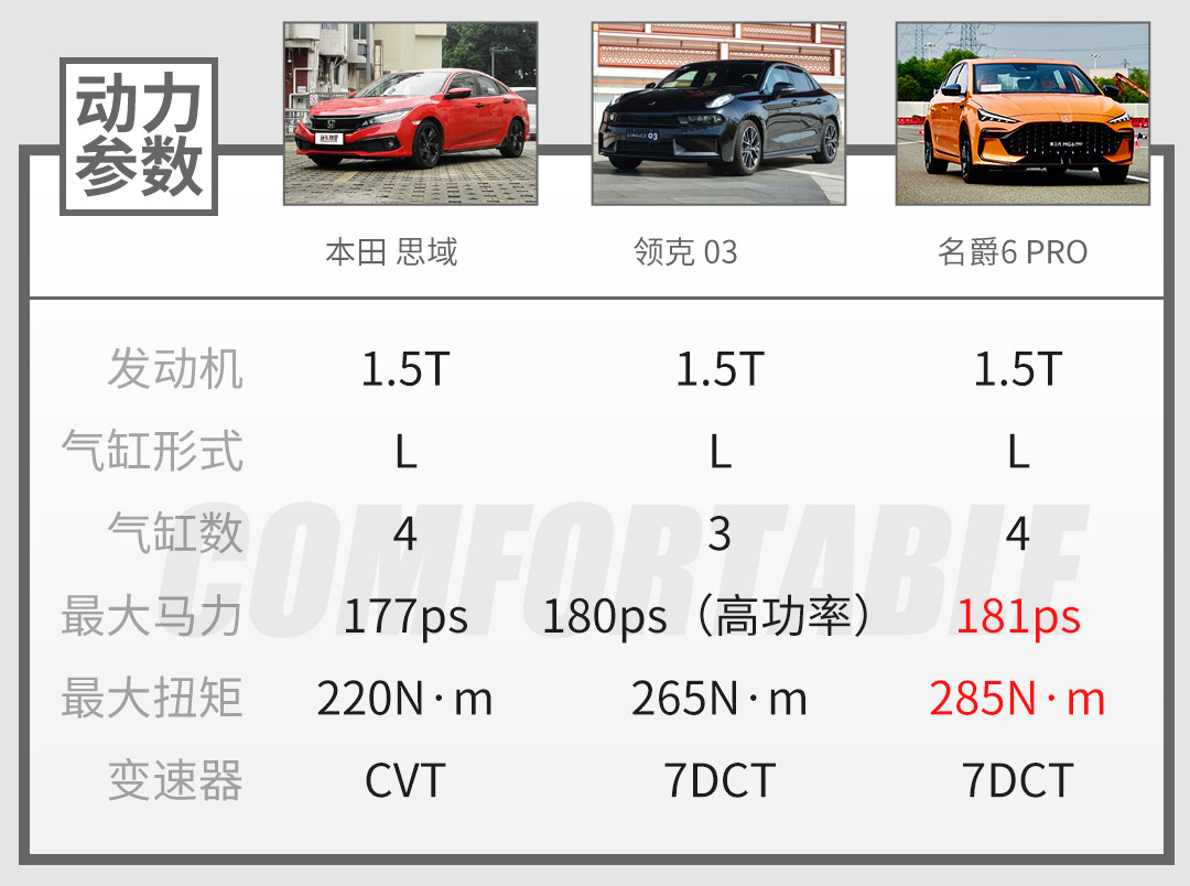 运动型轿车,第一定义就是性能。名爵6 PRO搭载了双十佳动力,1.5T发动机最大功率达到了181马力,峰值扭矩285牛·米,比领克03 1.5T的180匹和影豹1.5T的177匹数据上更有优势。