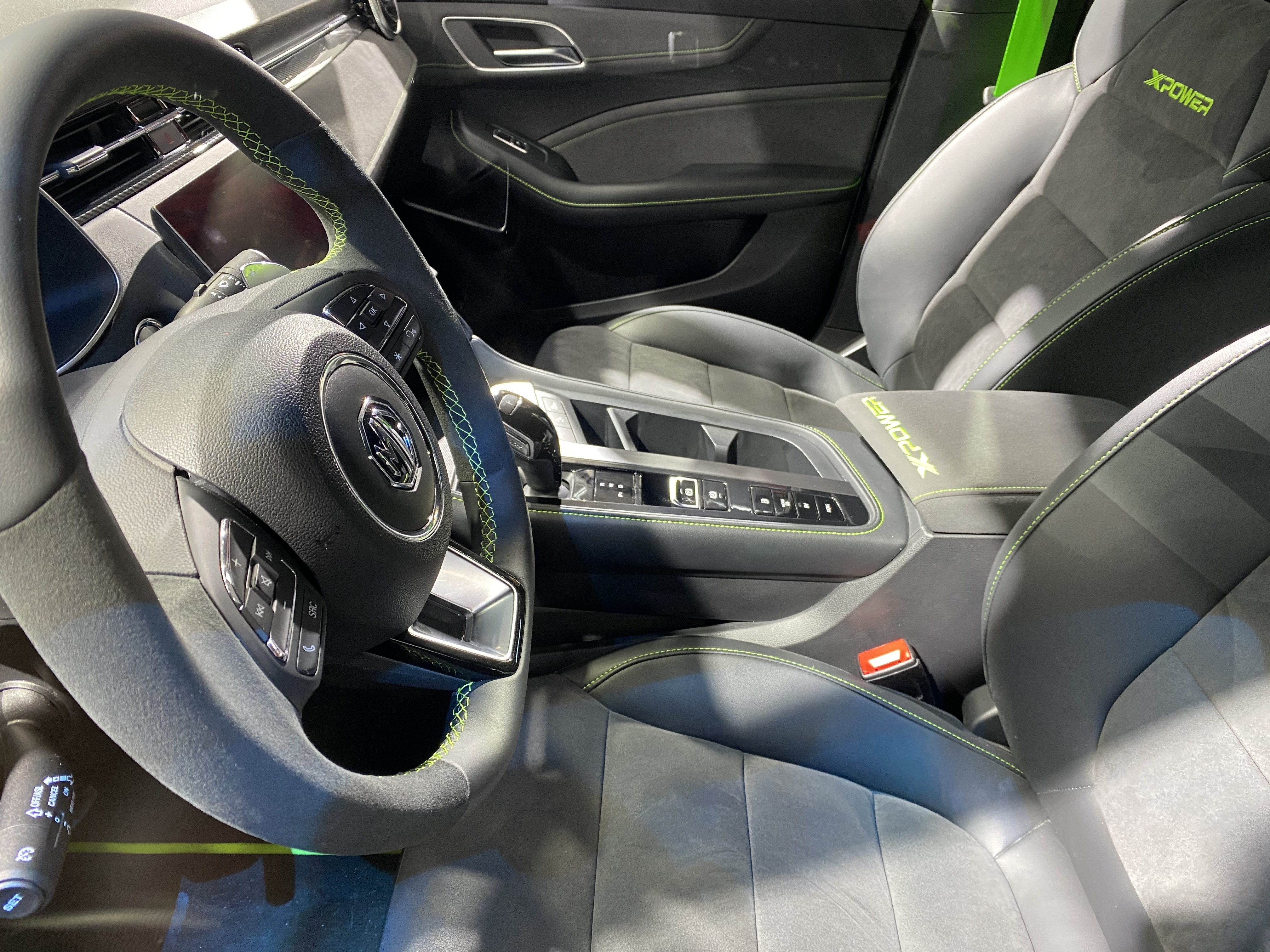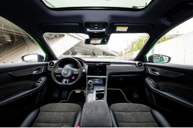 车内的变化就没有外观这么大了,基本与名爵6保持一致,但在用料上下足了功夫,加入了大量麂皮包裹,而且缝线也使用了绿色线条进行点缀,增加了车内的运动氛围。