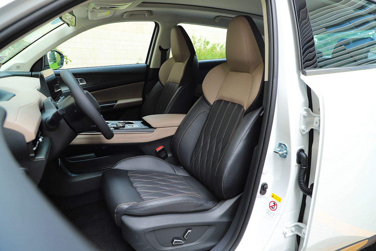 首先座椅上,全新CS55PLUS前排为一体式座椅,提升了视觉上的运动感,设计体验来看,填充物还是偏柔软的,保证舒适度的同时,两侧支撑性和整体包裹性也不错。