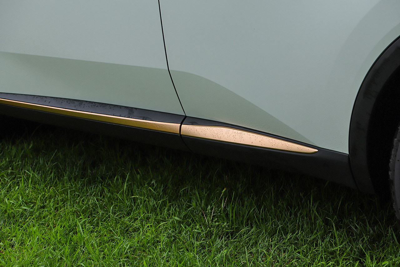 侧面除了靓丽的轮圈造型,还有车窗上镀铬饰条,车门下方还采用了香槟金色的饰板,配合白色车身,搭配的非常棒。