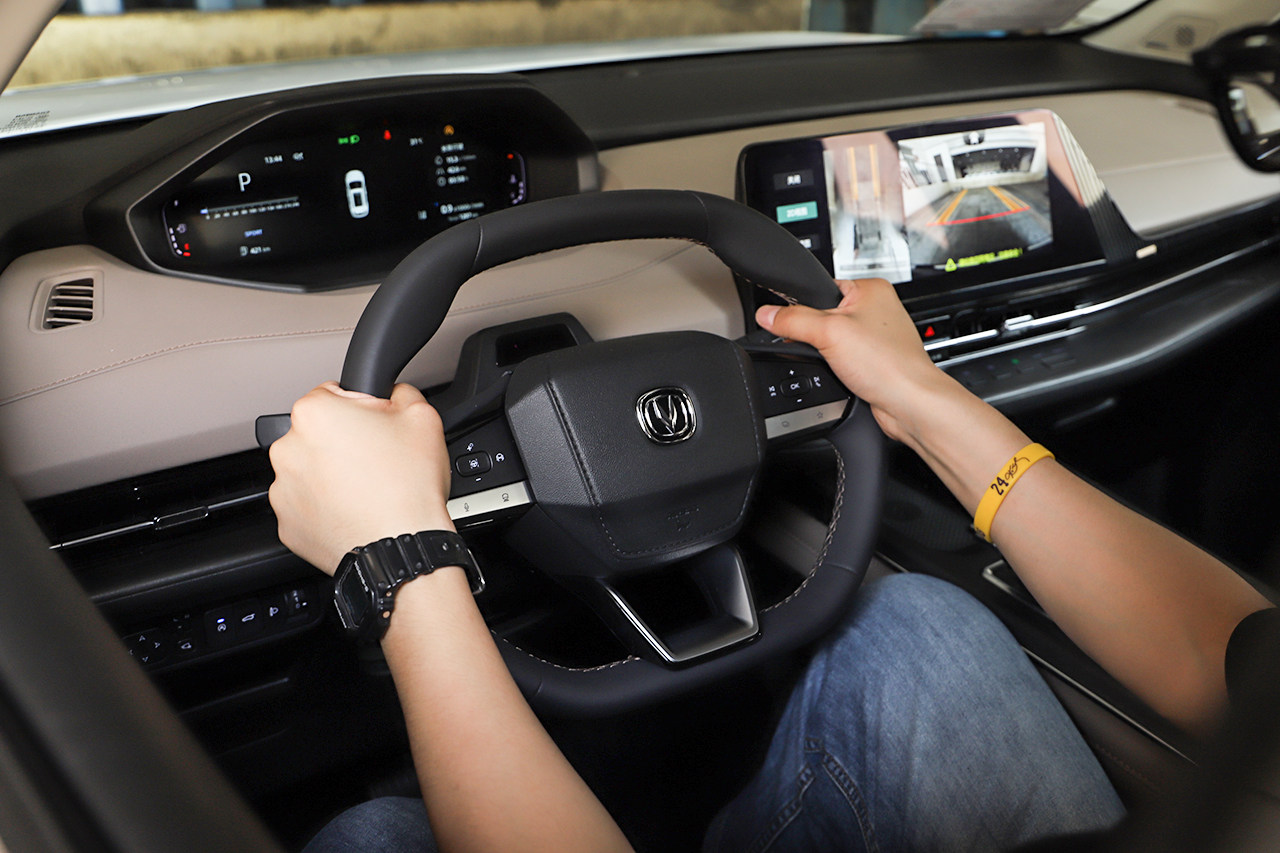 先说动力,考验双离合的第一步就是挂入D挡和R挡时的动力衔接,这方面全新CS55PLUS表现还不错,挂入之后基本马上就能感受到车辆的蠕动。但如果你在D和R之间反复切换,偶尔还是会略慢0.5s左右,这并不是我故意挑毛病,比较在狭小地方调头确实需要一直在D和R之间切换。