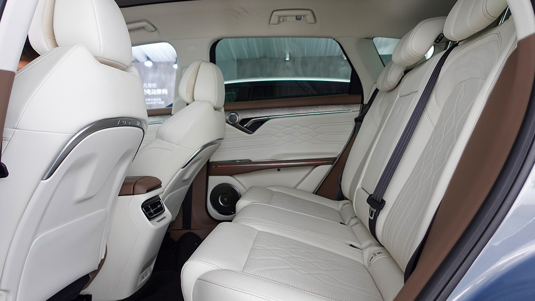 岚图FREE主打豪华大空间5座,座椅非常宽大、柔软并且厚,包裹性、承托性更好。介乎于它2960mm的轴距,前后排调整到合适位置,后排乘客还能轻松地翘起二郎腿。