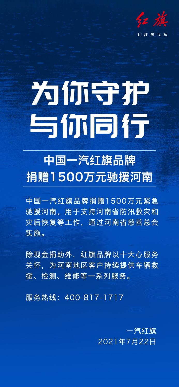 7月20日,河南部分地区降下千年不遇的暴雨,随之而来的洪水、城市内涝等灾害,给河南地区人民造成了生命财产的巨大损失,让红旗心之所系,情之所牵。随即,中国一汽携各品牌捐赠4500万元驰援灾区,其中红旗品牌捐赠1500万元;红旗更是在灾情发生24小时内,迅速推出了包含救援、检测、维修、复检、消杀、补贴等十项服务政策的“心服务十大关怀”,开通河南各地市19家线下体验中心的紧急救援热线,为河南受灾人民和红旗客户送去爱心与关怀。