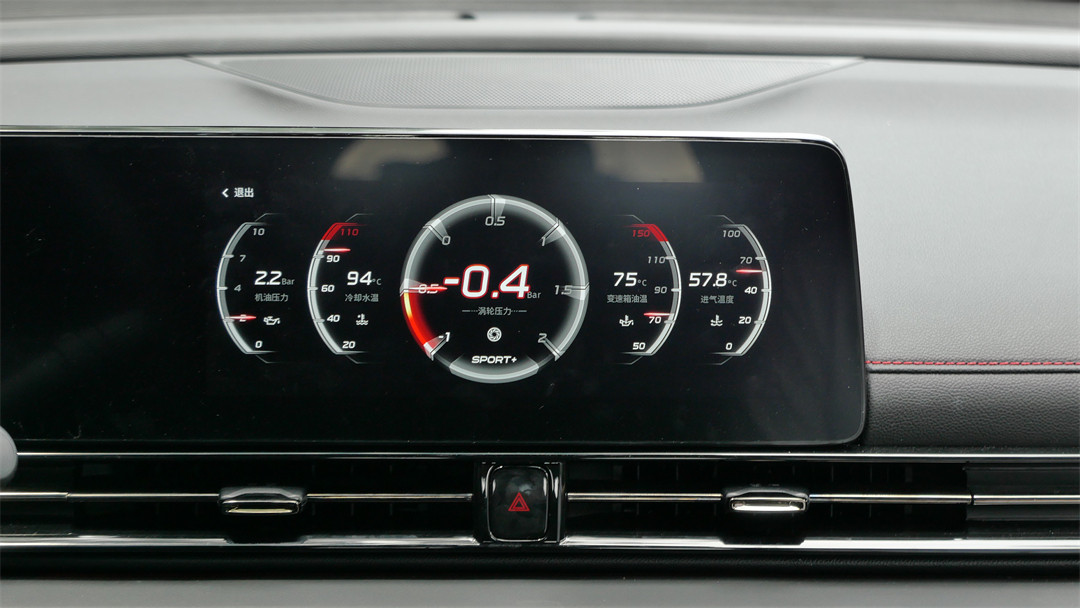 但有趣的是,传祺影豹还有一个存在一个“隐藏模式”——SPORT+模式,该模式是需要用户做任务才能解锁该功能。当然,我们拿到的试驾车已经是解锁状态了。处于该模式下,它的中控屏幕会切换成五连表的界面,上面会显示一些关于涡轮压力、水温、油温等信息,仪表盘也可以调出G值表。最重要的是,在该模式下排气的阀门也会选择默认打开,瞬间把车厢内的战斗感提升一个档次。