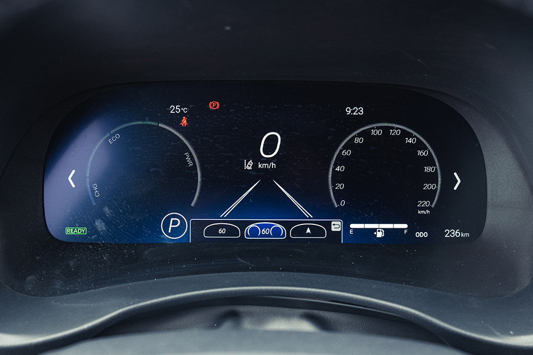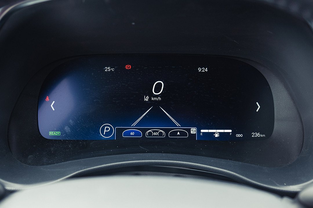 12.3英寸的全液晶仪表盘,是皇冠陆放车厢中的第一个惊喜。它的UI设计略显传统,没有很多炫酷的过场动画和科幻的仪表造型,丰田似乎只是把过往经典的机械仪表在这块液晶屏上复刻了一次,并且加入极简和导航两款“全新”的仪表布局。