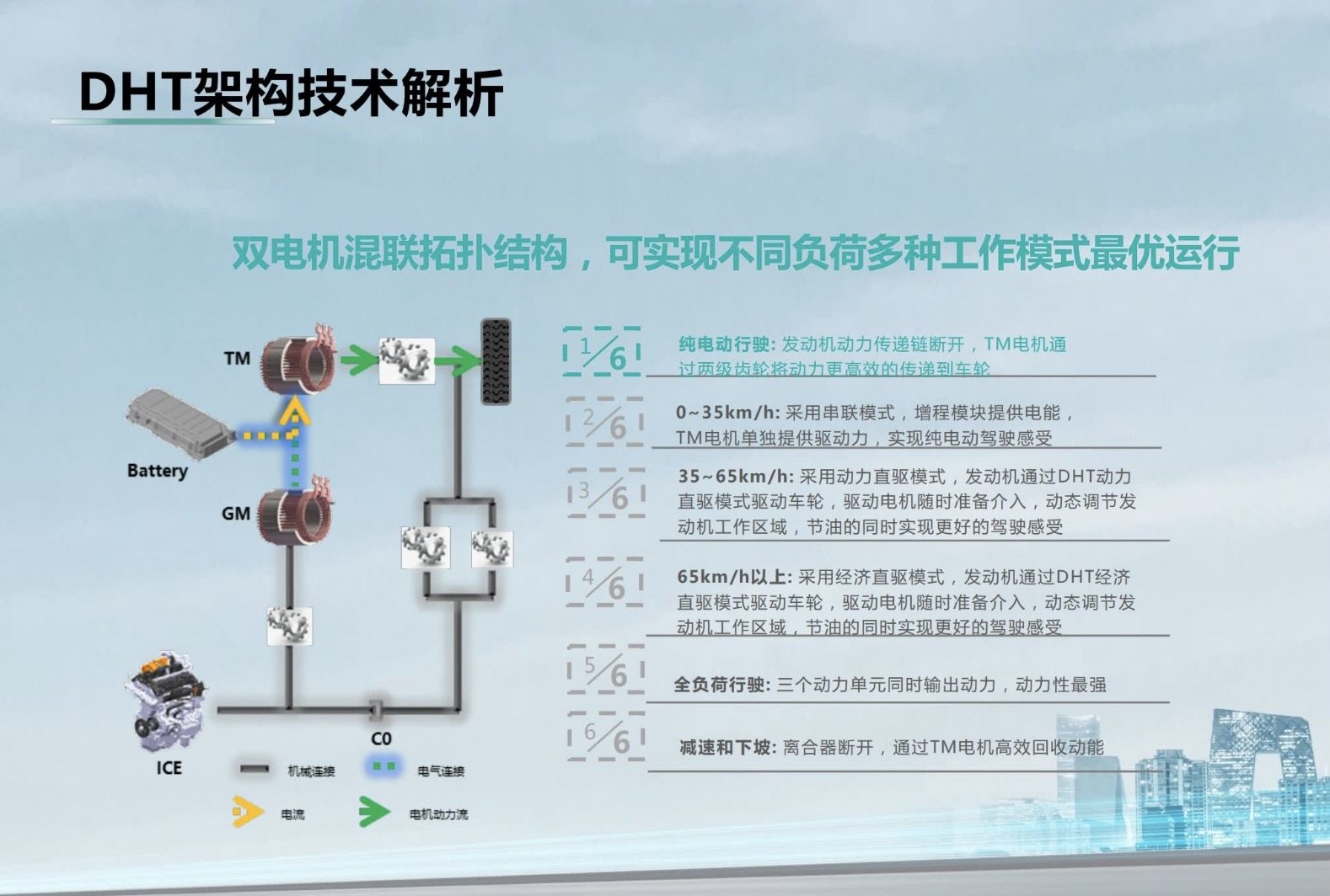 它的工作模式具体拆分开来有6种,在35km/h之前基本是电驱动,发动机只充当带动发电机来发电的作用。在35km/h之后,驱动车辆行驶就主要变成了发动机,而电机只是辅助作用。具体来说就是以下6种工作模式,直接上图让大家看吧。