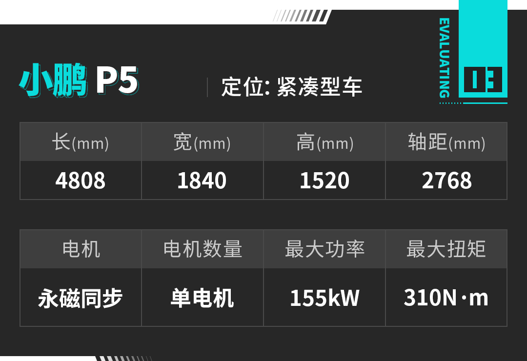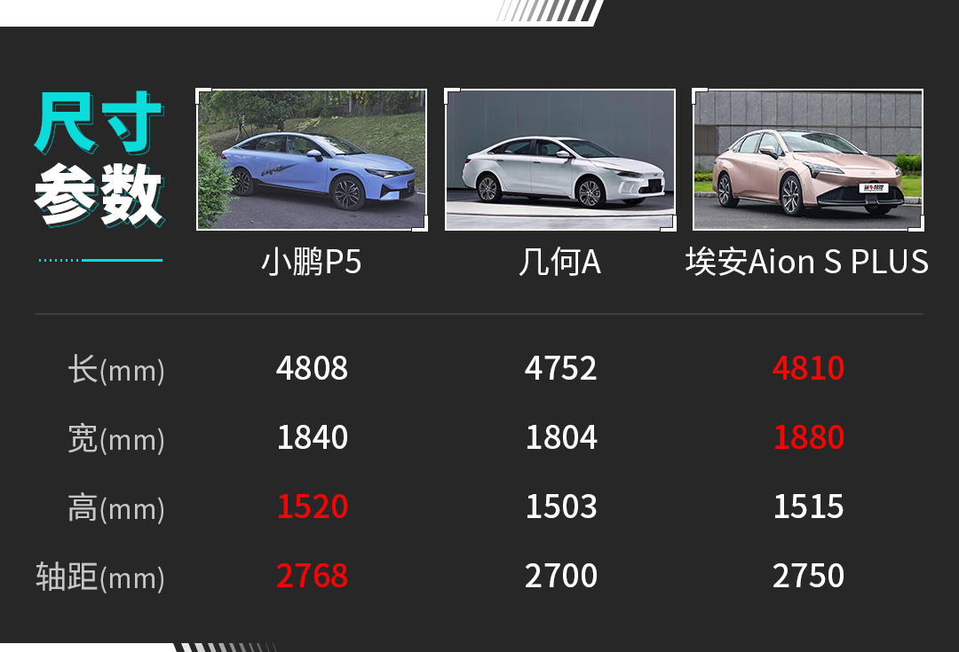 这里报一下小鹏P5的车身尺寸,长宽高分别为4808*1840*1520mm,轴距2768mm,一台A+级轿车的尺寸。