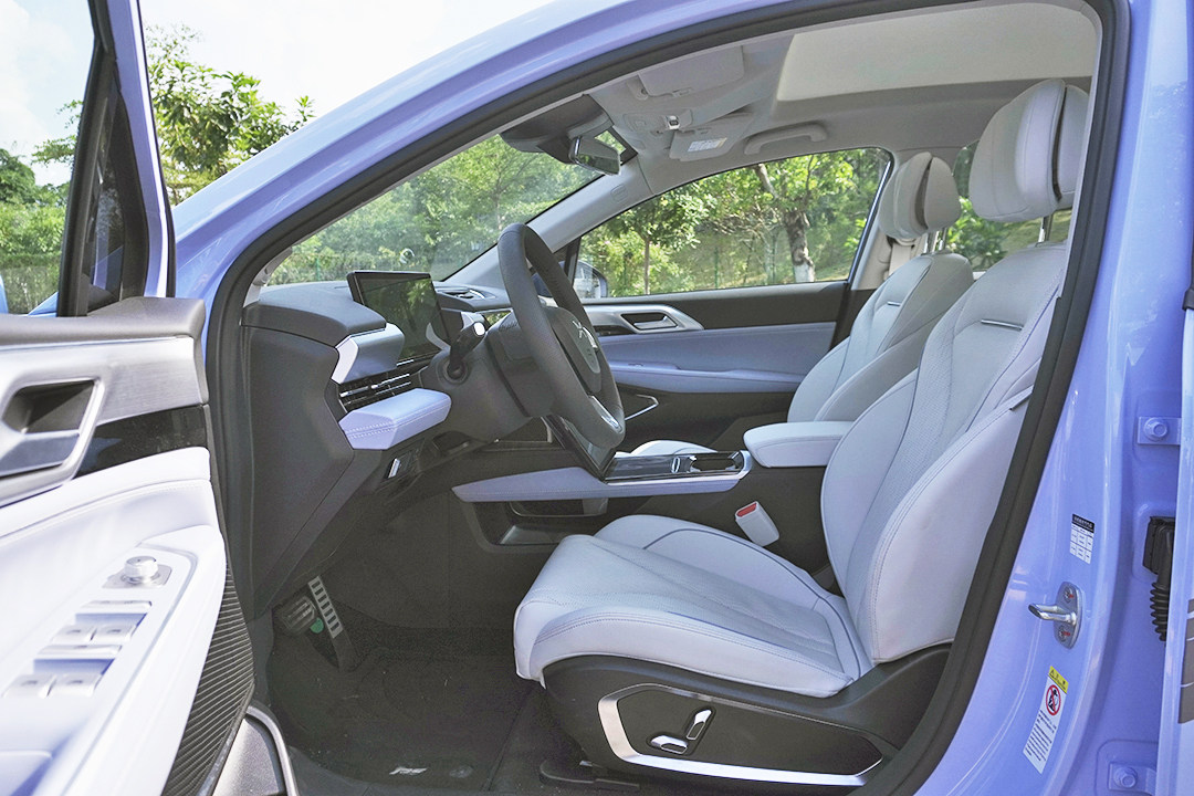 受限于平台以及电池包厚度因素,车内地台偏高,这导致前排的坐姿也偏高,尤其主驾座椅腿托高度不够,腿部也基本处于悬空状态。