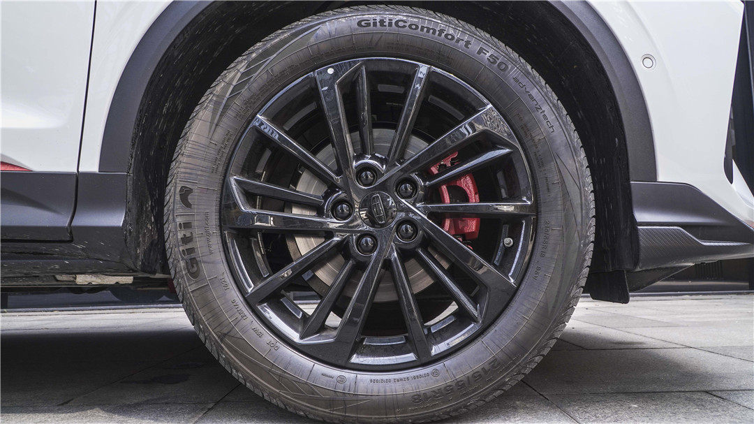 视线下移,刚毅深邃的俯冲线条和带有红色卡钳装饰的熏黑轮圈,很讨喜,只是这款18英寸的佳通轮胎主打的是家用,而非运动。