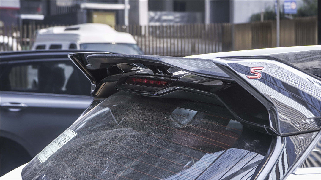 相比老款车型,新款车型的车尾还增加了仿碳纤尾翼,一来可以提高尾部的运动感,二来也能提高高速行驶时的稳定性。