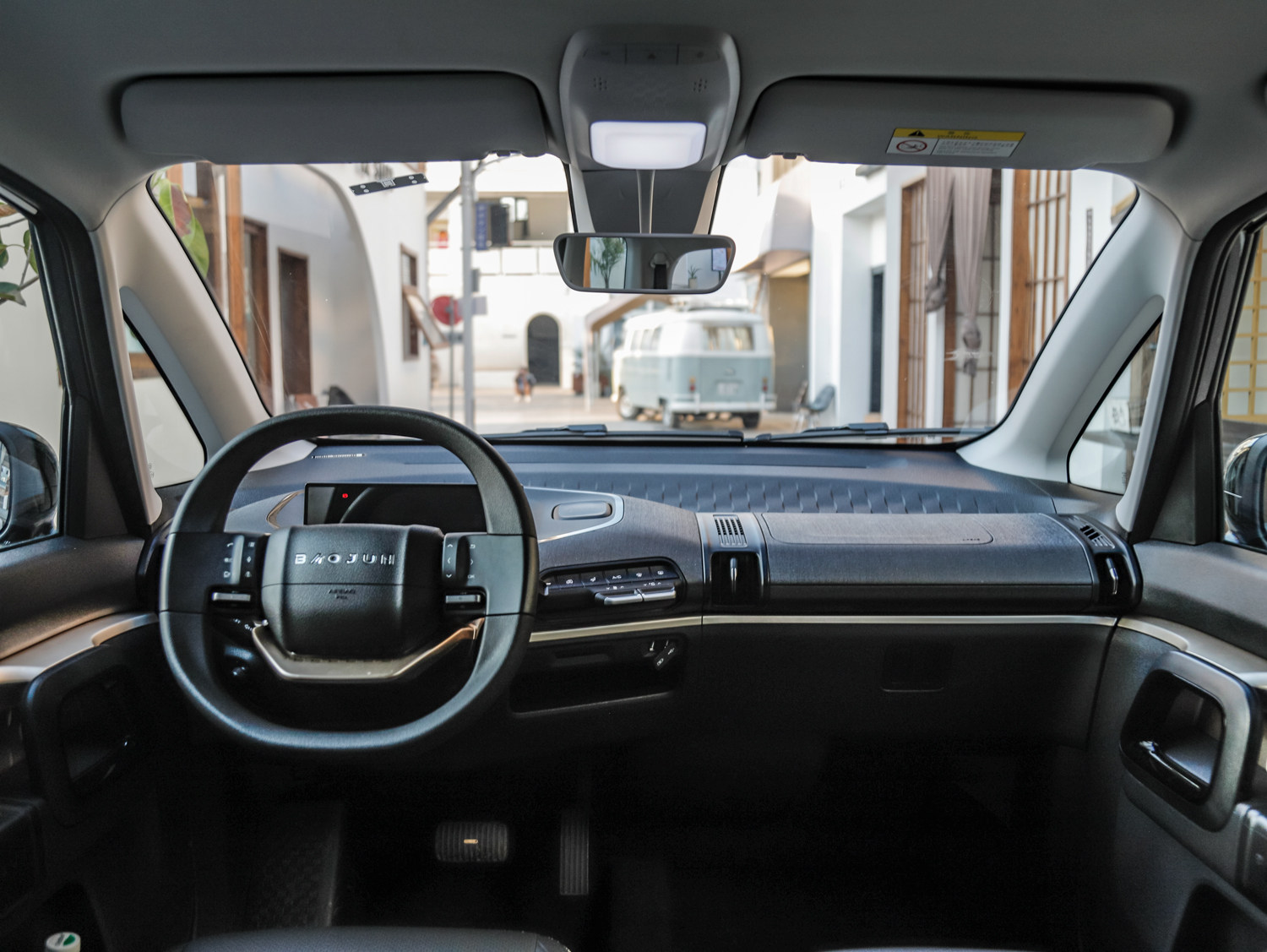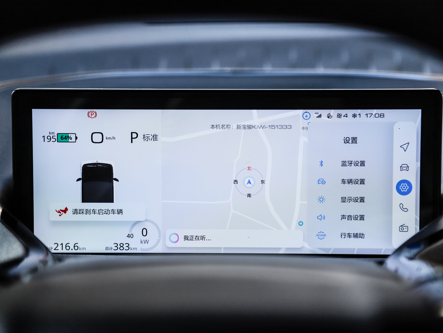 而为了让中控台看上去更整洁,宝骏KiWi EV放弃了中控屏幕,统一将功能配置集成到10.25英寸液晶仪表盘上,包括免唤醒语音交互系统、酷我音乐、百度地图等等一应俱全。另外在高配的车型上你还可以通过选装去获得自动泊车、自适应巡航、360度全景影像等配置。