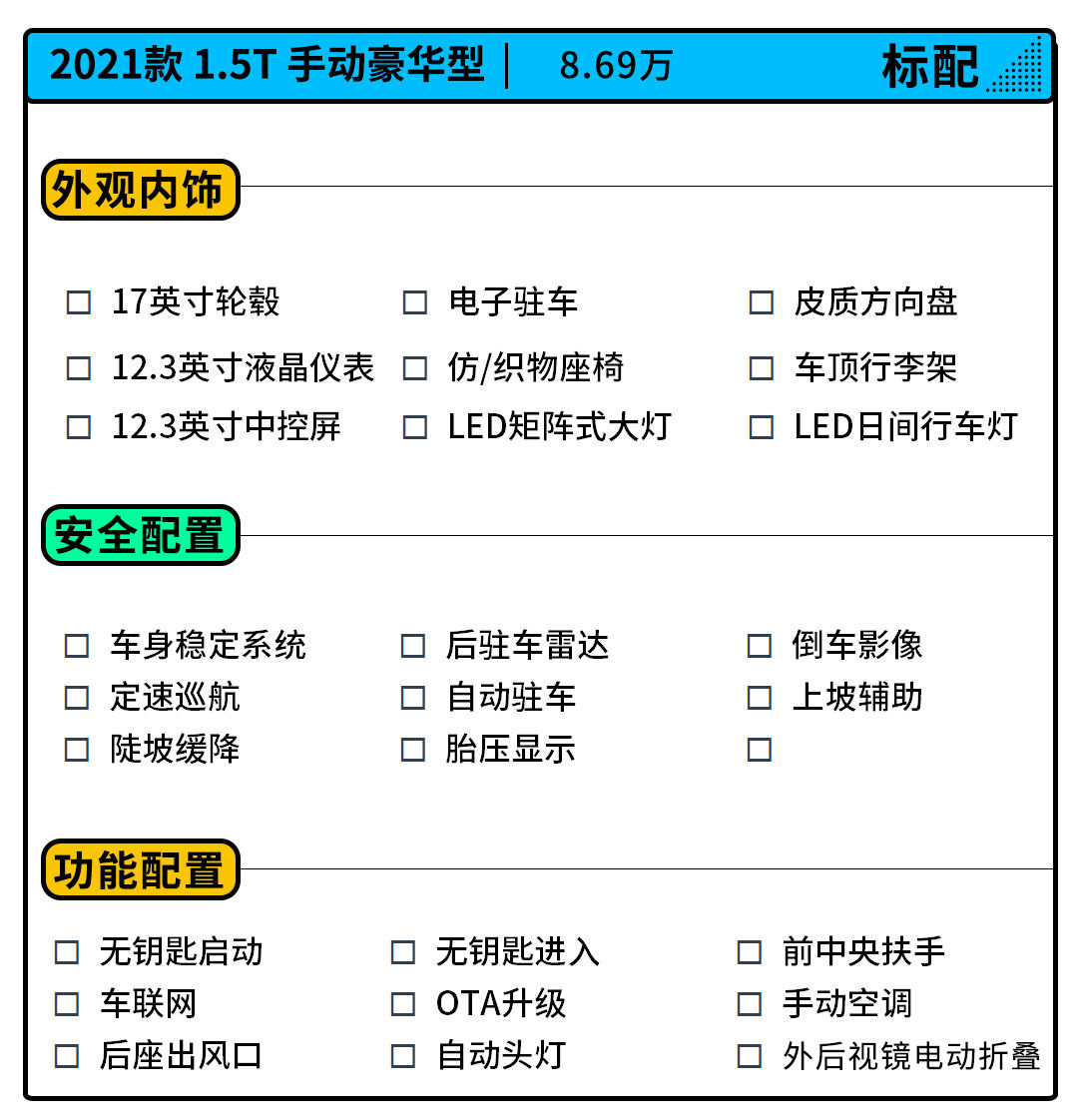 在配置方面,厂家还是给足了诚意,即便最入门级的“手动豪华型 ”,也配备了皮质方向盘、12.3英寸液晶仪表、12.3英寸中控屏、LED矩阵式大灯、无钥匙启动、车联网、后座出风口等。而在安全配置方面,诸如车身稳定系统、后驻车雷达、倒车影像、胎压显示、陡坡缓降等配备,可谓入门即高配。