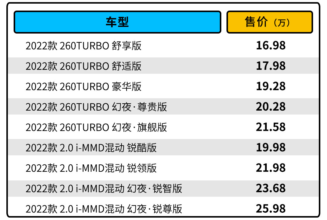 动力方面,新车继续提供燃油版和混动版两个版本,其中燃油版搭载1.5T发动机,最大功率为194马力,与之匹配CVT变速箱;混动则搭载第三代i-MMD混动系统,采用2.0L阿特金森发动机,发动机最大功率为146马力,电机最大功率184马力,系统综合功率为158kW。