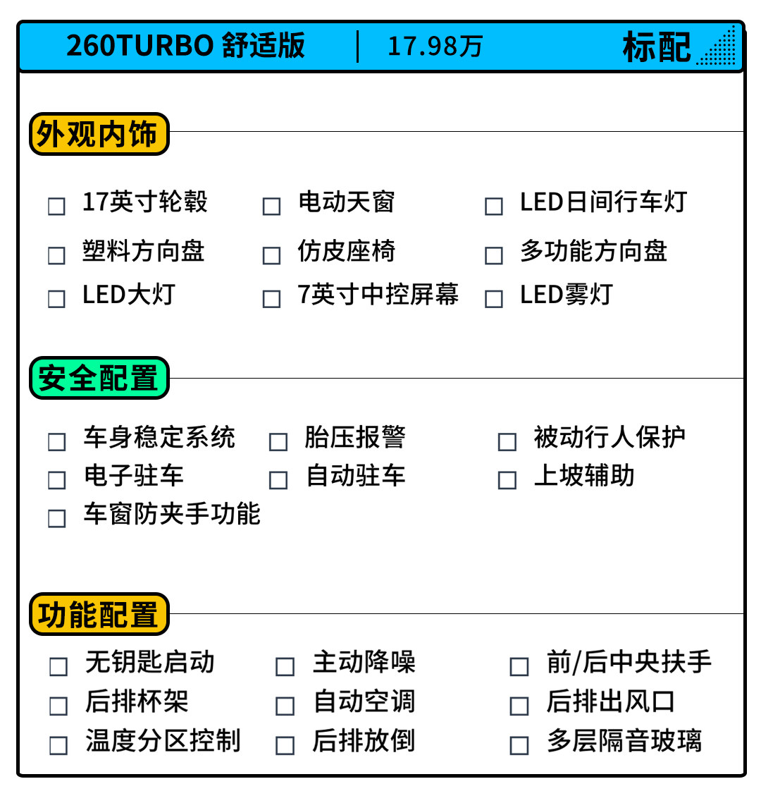 作为普通消费者能够买到的入门级车型,260TURBO 舒适版在配置方面基本和现款车型保持一致,配备有LED大灯、LED日间行车灯、多功能方向盘、电动天窗、主动降噪、多层隔音玻璃、7英寸中控屏幕、无钥匙启动、自动空调、仿皮座椅等舒适、实用的配置,虽然称不上多么丰富,但满足日常使用不成问题,比较适合预算有限的朋友。
