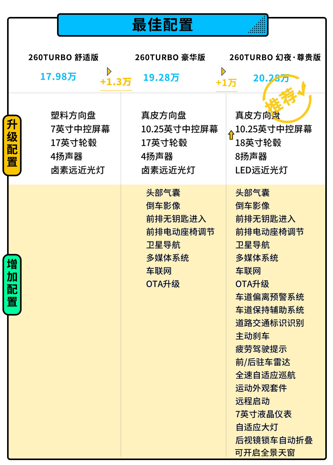 在燃油版的几款车型中,买买君推荐260TURBO 幻夜·尊贵版,相比260TURBO 豪华版,配置增加了全速自适应巡航、18英寸轮毂、运动外观套件、7英寸液晶仪表、主动刹车、前/后驻车雷达、车道偏离预警系统、可开启全景天窗等,舒适性配置和安全配提升了一个档次,而价格只贵了一万元。