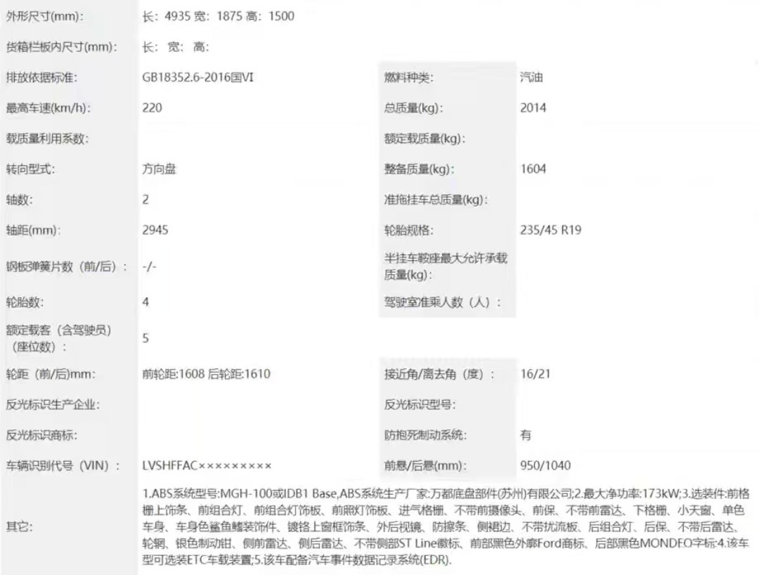动力方面,现款福特蒙迪欧搭载1.5T和2.0T两款四缸发动机,传递匹配6速自动变速箱。而根据申报信息来看,新车将搭载一台由长安福特汽车有限公司生产的型号为CAF488WQC的2.0T涡轮增压发动机,其最大功率为238马力,峰值扭矩376牛·米,超越现款车型的动力参数。传动系统方面,预计匹配8速手自一体变速箱。