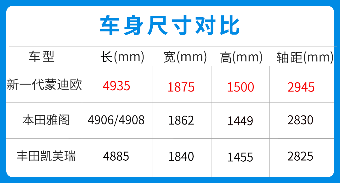 尺寸方面,新一代蒙迪欧长宽高分别是4935/1875/1500mm,轴距达到2945mm,车长比现款增加了62mm,轴距增加了95mm,这无疑是最为明显的提升。对比同级别最畅销的本田雅阁、丰田凯美瑞和大众迈腾等车型,在尺寸上也占据了优势,这对于看重空间表现的国人来说,具有很强的诱惑力。