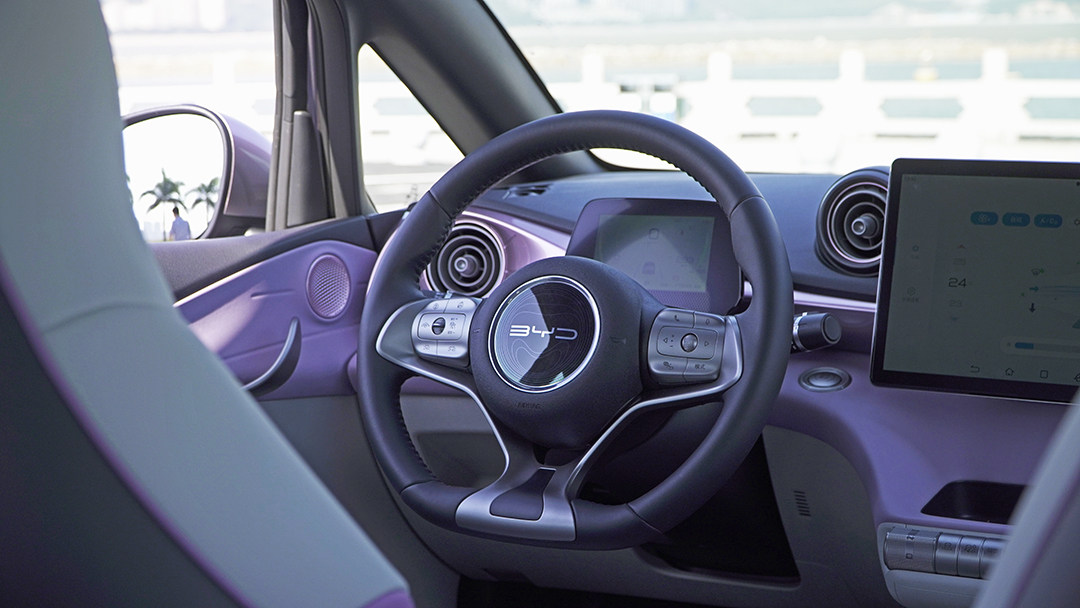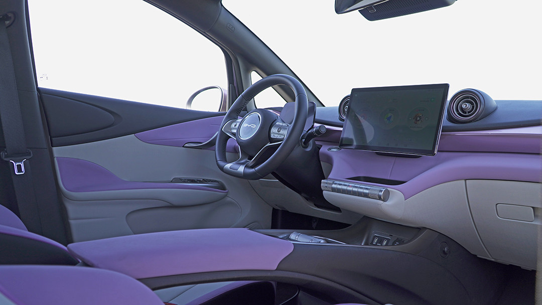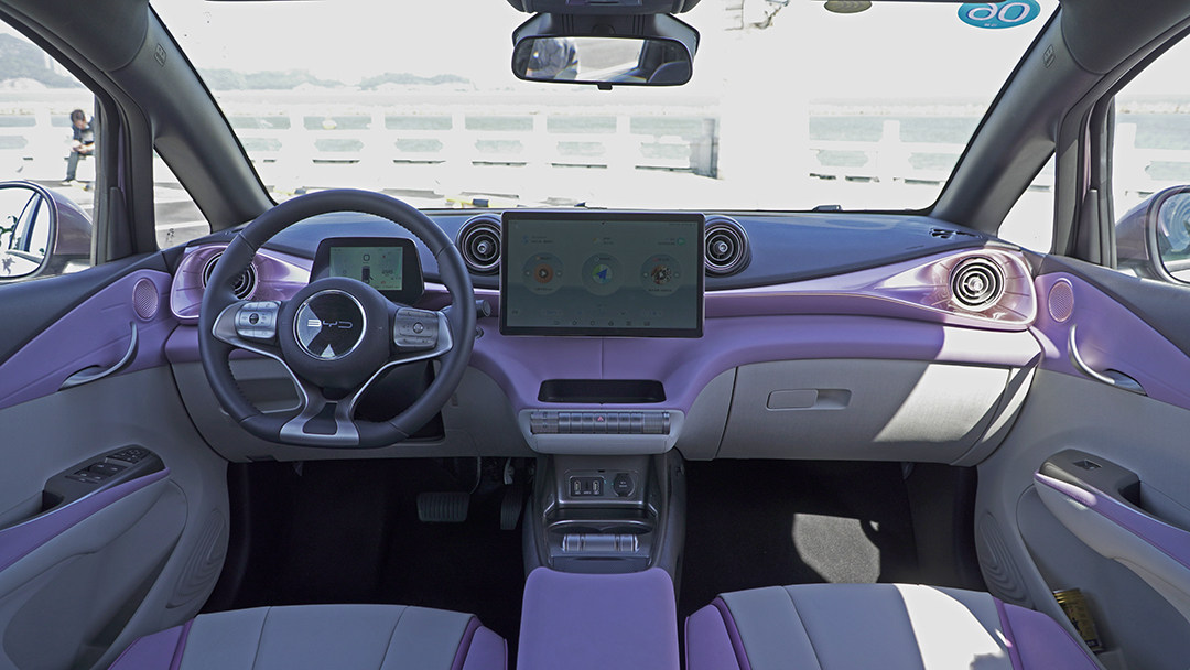 中控台舒展的曲线环绕效果很有波浪感,没有死板的运用横平竖直的线条来设计,与车身同色的拼色装饰件和门板亲肤面料处理,包括柔软的皮质座椅和印花面料的使用,都是体现海豚车厢精致感的地方。