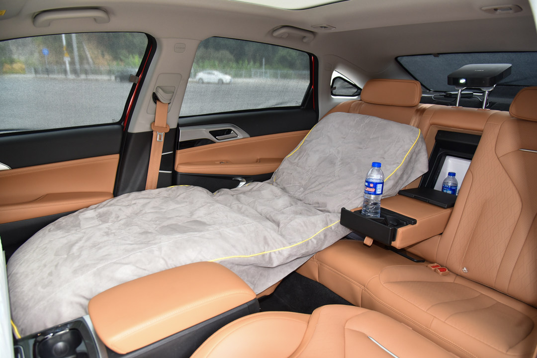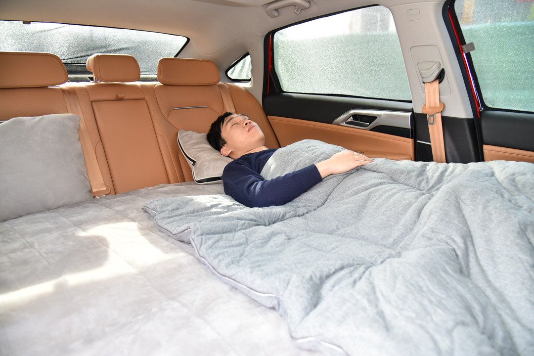 其次,小鹏P5提供了定制的舒适睡眠套装,包含了Air云感速充床垫、Air云感抱枕被、Air记忆圆柱枕等,其中床垫通过车载电动充气泵可在5分钟内完成充气,铺装到车内时能形成接近1.5米双人床的舒适睡眠空间,加上系统还会自动播放助眠轻音乐以及开启香氛系统,最后挂上定制的单向私密帘,能让你瞬间进入一个私密的空间休息。