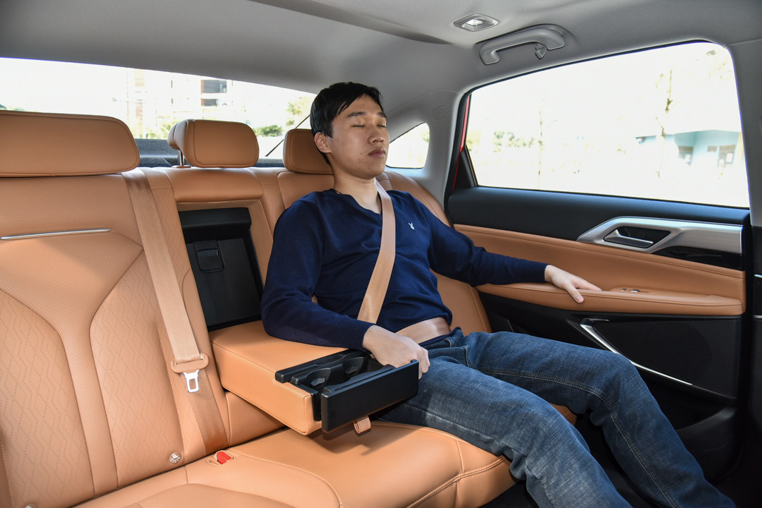 保持前排座椅位置不动,当体验者落座后排时,头部空间余量为一拳,而腿部空间余量更是超过了三拳,经过教授实测第二排腿部有效空间达到了991mm,可谓是冠绝同级般存在。而如此宽敞的空间表现,哪怕是身高185 cm的成年人乘坐小鹏P5时也能找到惬意的坐姿,很符合中国家庭用户对于“大”的追求。