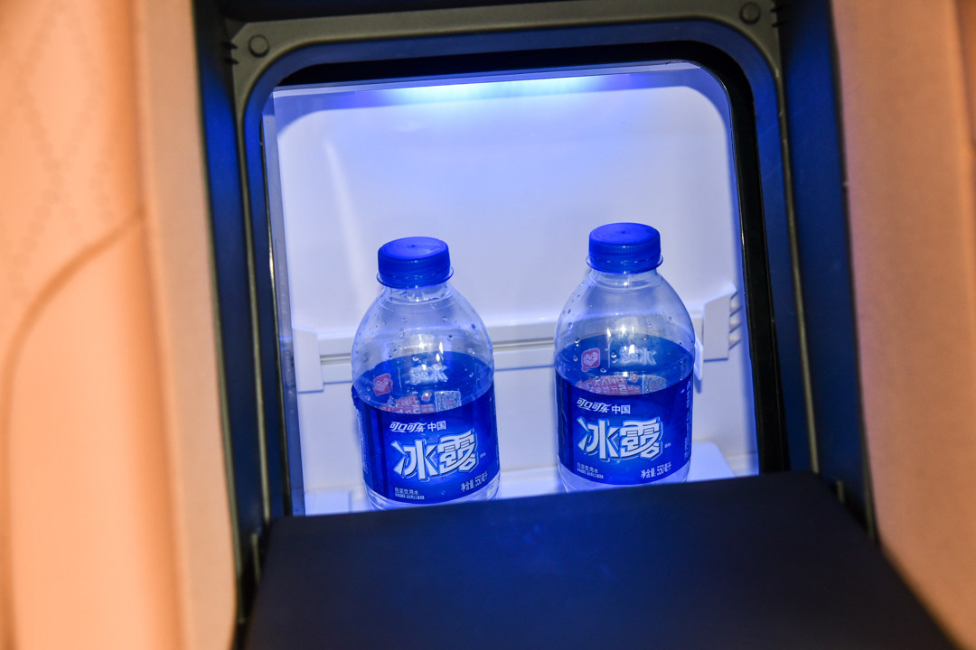 在看剧/看球的同时,怎能不来点饮品或美食助兴呢?为此小鹏P5还在后排中央扶手处提供了车载美食智能冰箱,凭借17.2L的容积,实测可放进7瓶以上的500ml饮料,并且温度最低可调节至-6℃,打开的同时还伴随着灯光照明。