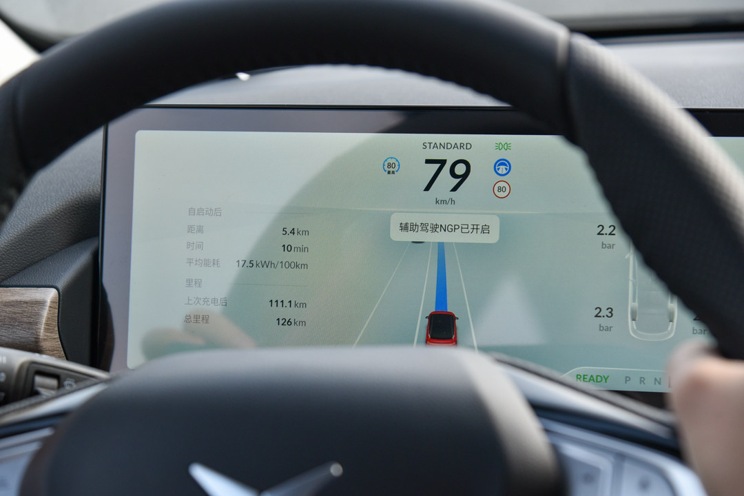 经过教授实测,NGP领航状态下的小鹏P5会按照设定好的车距及车速自动沿着的导航路线行驶,过程无需人工控制车速及转向,大大缓解了驾驶员长途出行的疲劳感。