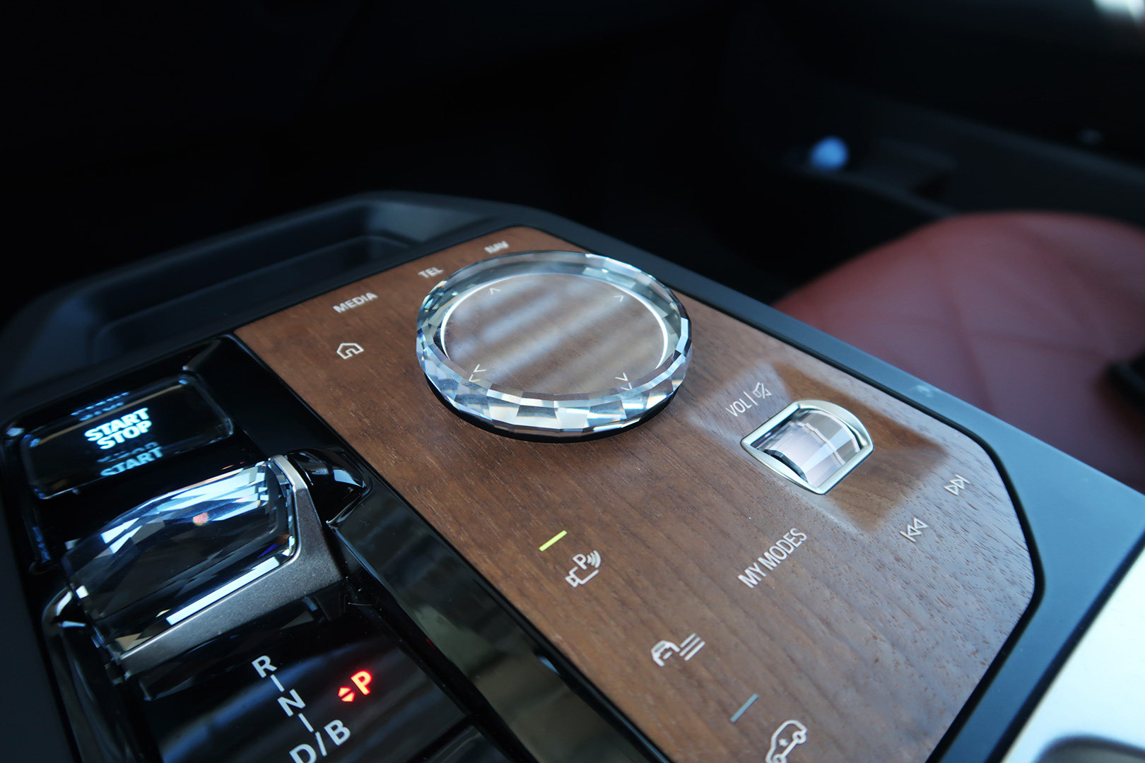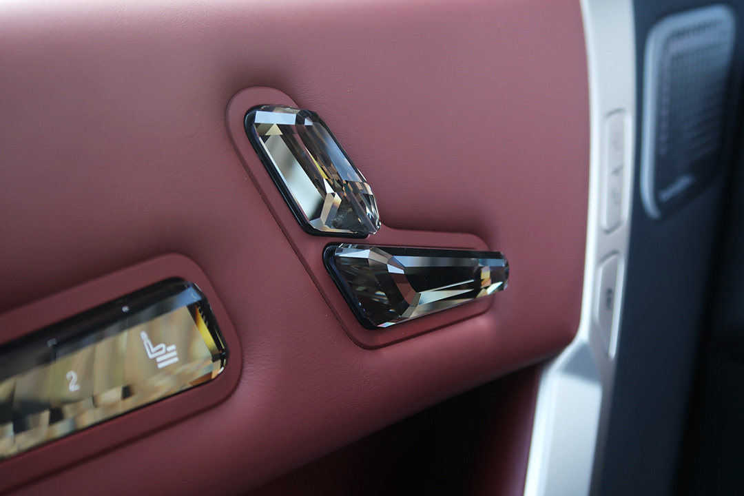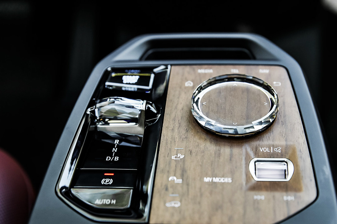 除了用料环保外,还有精致。嵌到门板上的座椅调节按键,采用的是类黑水晶的玻璃材质;岛台上的iDrive旋钮、音量滚轮、电子挡把则是类白水晶元素。