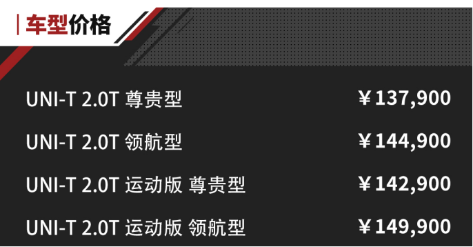 长安UNI-T 2.0T车型的顶配价格,仅比1.5T顶配车型贵了1.1万元,同时2.0T中低配车型都不超14.29万。