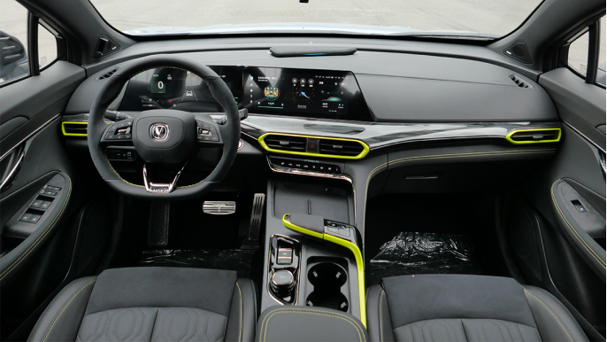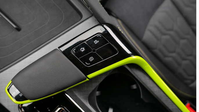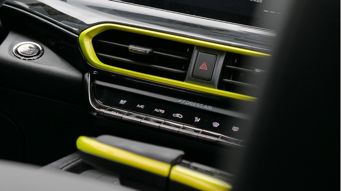 空调出风口边框、挡把台以及缝线部分大量采用荧光色元素,与外观风格相得益彰。