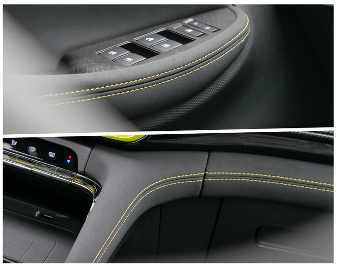 车内的用料和搭配我也比较喜欢,有类似翻毛皮材质的,还有带图案纹理的饰板等等,不论看起来或摸起来都很不错。