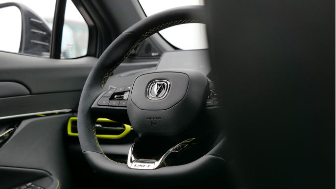 方形盘转向力度也是可调的,日常驾驶可以选择轻一些。不过对于我个人而言,跑赛道喜欢更紧致更有质感的转向,所以选择了更运动更重的力度。
