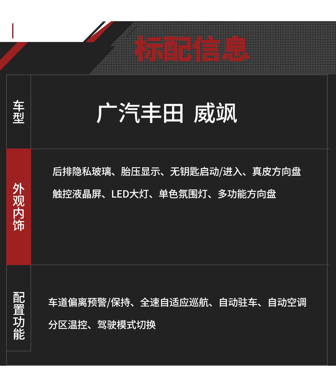 诚然,威飒的出现很好的补充了威兰达和汉兰达之间的价位市场。在消费定位上,威飒也给予了20-30万级别市场里给予消费受众享受驾乘质感、追求配置水准、讲究经济适用的消费选择。