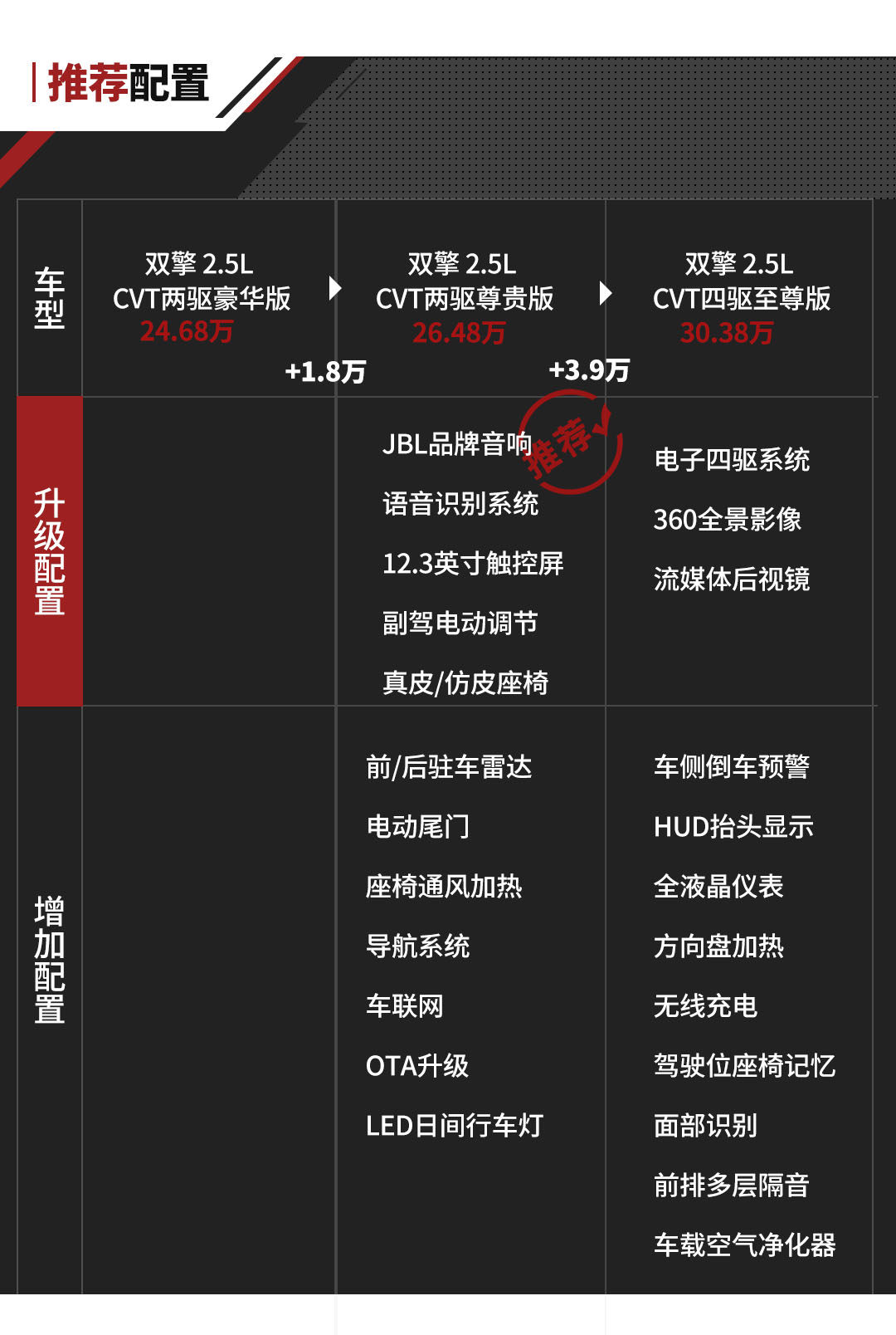 且增加了电尾门、座椅通风加热、驻车雷达等日常使用率高的功能,且相较于豪华版仅仅需要多支出1.8万。