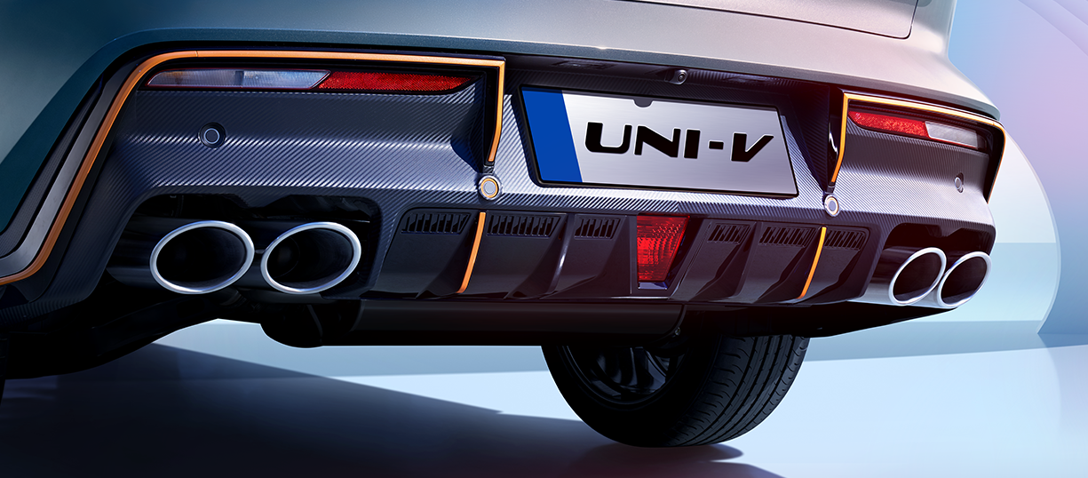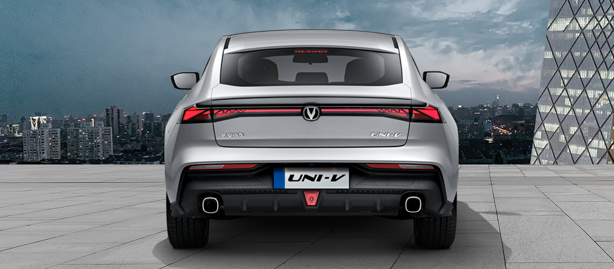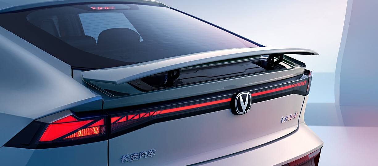 长安UNI-V车尾采用时下流行的贯穿式尾灯设计,有效拉宽车型横向视觉效果,点亮后带来璀璨的视觉效果。值得一提的是,该车还搭配了可升降电动尾翼,开启时提供25kg极限下压力,有效减少0.007风阻系数,大大提升该车疾速运动性能。